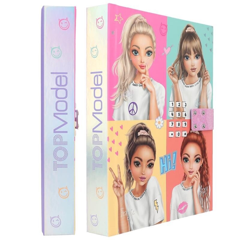 Coole foto's van de TOPModels: het dagboek met vier portretten van de TOPModels gaat alleen open als je de juiste 4-cijferige code invoert (persoonlijk in te stellen en te veranderen). Dan hoor je de hit Shivers voor ca. 20 seconden. Het dagboek heeft binnenin 80 fleurige pagina's met fijne lijntjes.