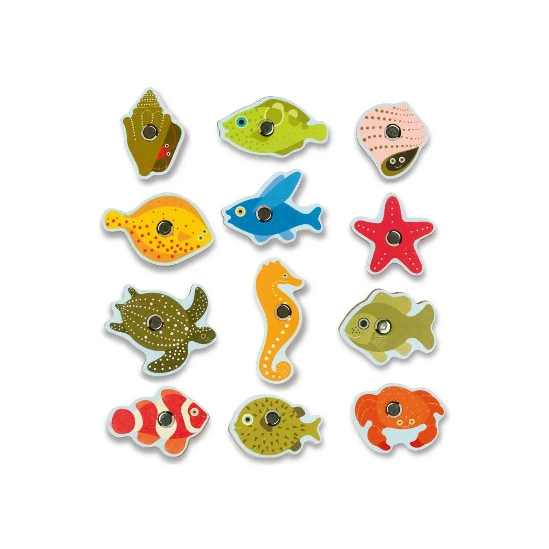 Klaar voor een visreis? Houten zeedieren, 2 hengels en een mooie doos die verandert in een zeebodem. Het kind pakt de gemagnetiseerde houten stukken met de hengel. Het visfeest kan beginnen! Voor kleine vissers vanaf 2 jaar.