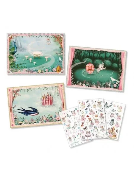 Een grote zak met een heleboel decals en 3 grote geïllustreerde achtergronden om in te vullen over het fascinerende thema feeën! Het kind kiest een achtergrond en plaatst de over te brengen elementen erop. Met een potlood wrijven ze over de afbeeldingen om ze op de gekozen plek te leggen. Het is een leuke en gemakkelijke manier om je eigen sprookjesachtige afbeeldingen te maken.