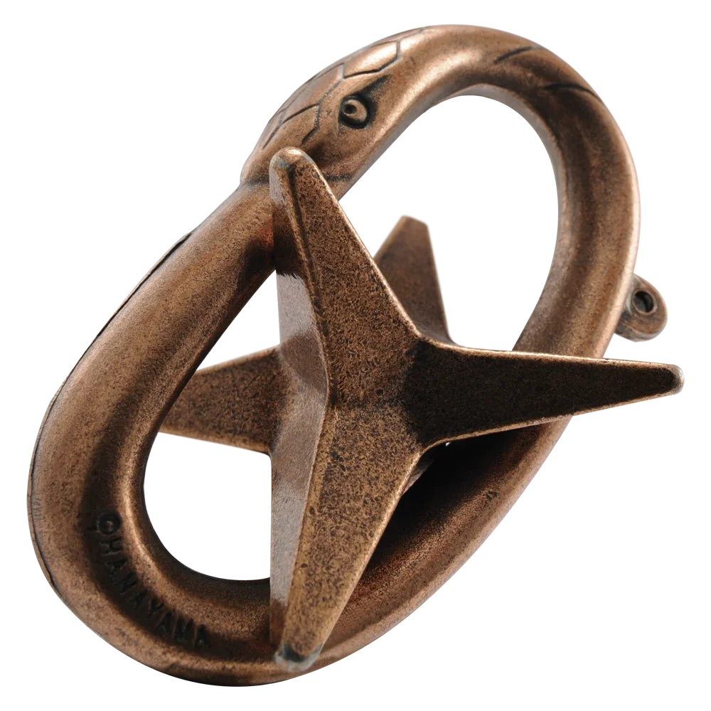 A la fin du 19 ième siècle, la Grande- Bretagne connut la grande manie des casse-tête. J’ai réussi à m’approprier, malgré leur rareté, un certain nombre de casse-tête célèbres de cette époque, en explorant les marchés aux puces. Basé sur les originaux de cette période, nous avons fait revivre celui-ci dans sa nouvelle forme. La partie essentielle de ce casse-tête est l’ étoile qui doit être libérée du serpent qui la retient. Si seulement l’étoile n’était pas aussi obstinée à vouloir toujours retourner au serpent !