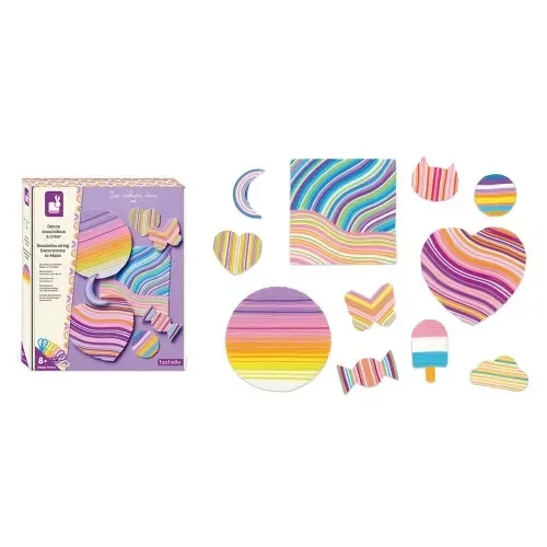 Vous connaissez forcément les scoubidous, mais les avez-vous déjà utilisés pour créer des objets déco ? Avec ce kit créatif, les enfants à partir de 8 ans et même les plus grands peuvent réaliser 11 créations acidulées ! D'abord, 3 tableaux sur lesquels les fils se collent pour former des paysages toujours plus colorés. Créez des ondulations, des dégradés ... Ensuite, 8 stickers de différentes formes à décorer que les enfants peuvent offrir ou conserver comme un trésor. Ce coffret créatif scoubidous contient : 3 tableaux autocollants, 1 planche de 8 stickers, 60 fils de scoubidous (10 couleurs différentes). Un livret avec modèles et instructions est également inclus, pour réaliser ses décos scoubidous comme un pro ! Grâce à cette activité manuelle, les enfants développent leur dextérité et leur minutie tout en exprimant leur créativité. C'est un loisir créatif plein de peps, à offrir pour l'anniversaire d'un fou de scoubidous ! Au total, cette activité nécessite 5h de création (il faudra compter environ 1h par tableau et 15 minutes par stickers). La variété des créations proposées permet de satisfaire les plus impatients comme les plus minutieux !