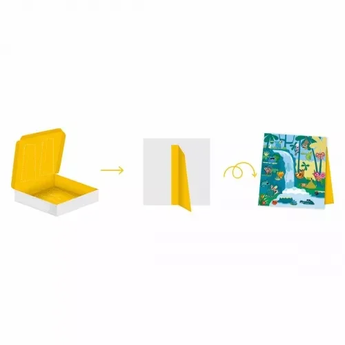 Voici un kit créatif très complet qui permettra aux enfants à partir de 5 ans de s'amuser avec des gommettes et des décors tout droit sortis de la jungle ! Ce coffret permet de réaliser 3 décors et 2 tableaux grâce à des gommettes de toutes les couleurs. On laisse parler son imagination pour créer des univers plein de couleurs et d'animaux exotiques grâce aux petits autocollants adaptés aux mains des artistes. Malin la Clever Box, la boite se transforme en chevalet pour exposer les belles créations. Il faut environ 1h30 pour la réalisation complète de ce coffret. Ce coffret créatif fait partie de la gamme My Arts & Crafts qui présente des animaux tout mignons aux couleurs pastel et qui propose aux plus petits leurs premières activités de création.