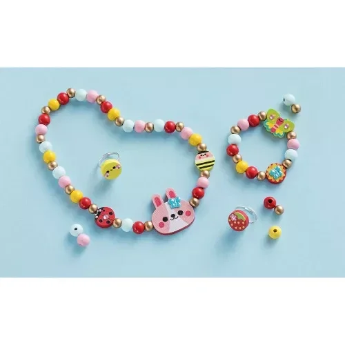 Le premier atelier de création de bijoux des petits ! Avec ce kit créatif, les enfants dès 4 ans vont réaliser facilement une jolie parure : 2 bagues, 1 collier et 1 bracelet. Sur le thème du jardin, ces 4 bijoux en bois sont aussi sympathiques à créer qu'à porter pour les tout-petits ! Fabriquer des bijoux avec des perles permet aux enfants de développer leur motricité fine et leur créativité, ils apprennent aussi à réaliser des suites de couleurs ou par taille, pour des bijoux du plus bel effet. Ce coffret de loisir créatif contient : 2 perles en bois silhouettées et imprimées, 3 perles en bois rondes et imprimées, 33 perles en bois rondes et colorées, 22 perles en bois dorées, 2 bagues avec perles en bois plates et imprimées, 1 planche de 8 strass et 1 fil élastique. Un livret avec les modèles et les instructions est inclus, pour guider l'activité. Le bois est robuste et très agréable à porter, les imprimés bucoliques et les perles dorées donnent aux bijoux une certaine personnalité. L'autre atout de ce coffret créatif, c'est sa boîte super chouette ! En effet, elle devient un joli petit sac dans lequel on peut ranger ses bijoux, mais aussi tous ses trésors et ses secrets. Alors, parez-vous de vos plus beaux bijoux en perles et partez explorer le jardin !