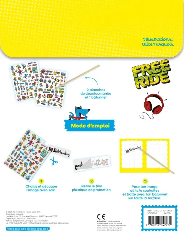 Une pochette contenant 2 planches de décalcomanies (50 décalcos par planche) et un bâtonnet en bois sur le thème de la glisse et du street art (snow board, skate, surf, roller, tags, messages) pour customiser son agenda, ses cahiers ou son carnet secret.