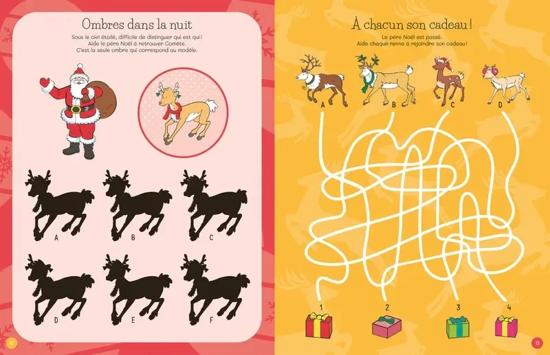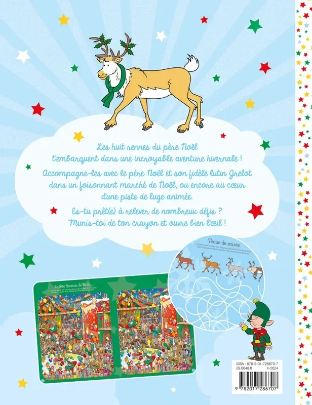 Un cahier de 48 pages avec des jeux et activités variés sur le thème de l'hiver et des rennes du père Noël : labyrinthes, différences, suites logiques, mots mêlés, sudoku, puzzle, intrus... Sans oublier des jeux de cherche et trouve.