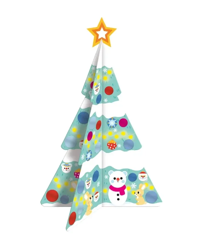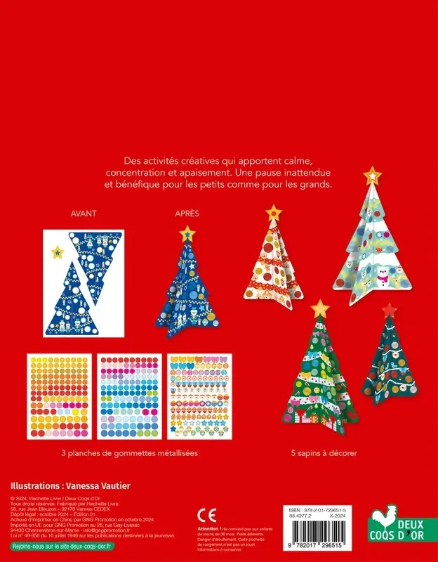 Une pochette proposant de créer 5 sapins de Noël de 3 tailles différentes (2 grands de 19 cm de haut, 1 moyen de 15,5 cm et 2 petits de 12 cm), puis de les décorer. Pour chacun : une étoile à placer au sommet et 3 planches de 120 gommettes métallisées (boules de Noël, cadeaux, sucres d'orge, petits animaux, flocons de neige...). À chaque sapin son ambiance colorée : enneigée, étoilée... Pas à pas illustré fourni.