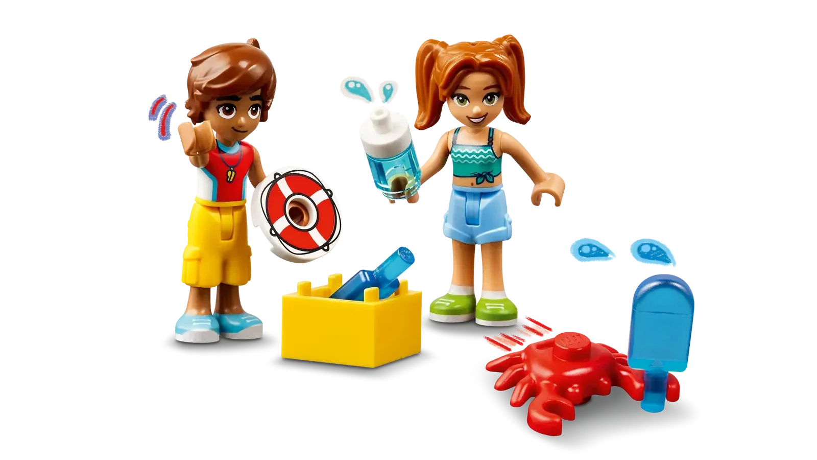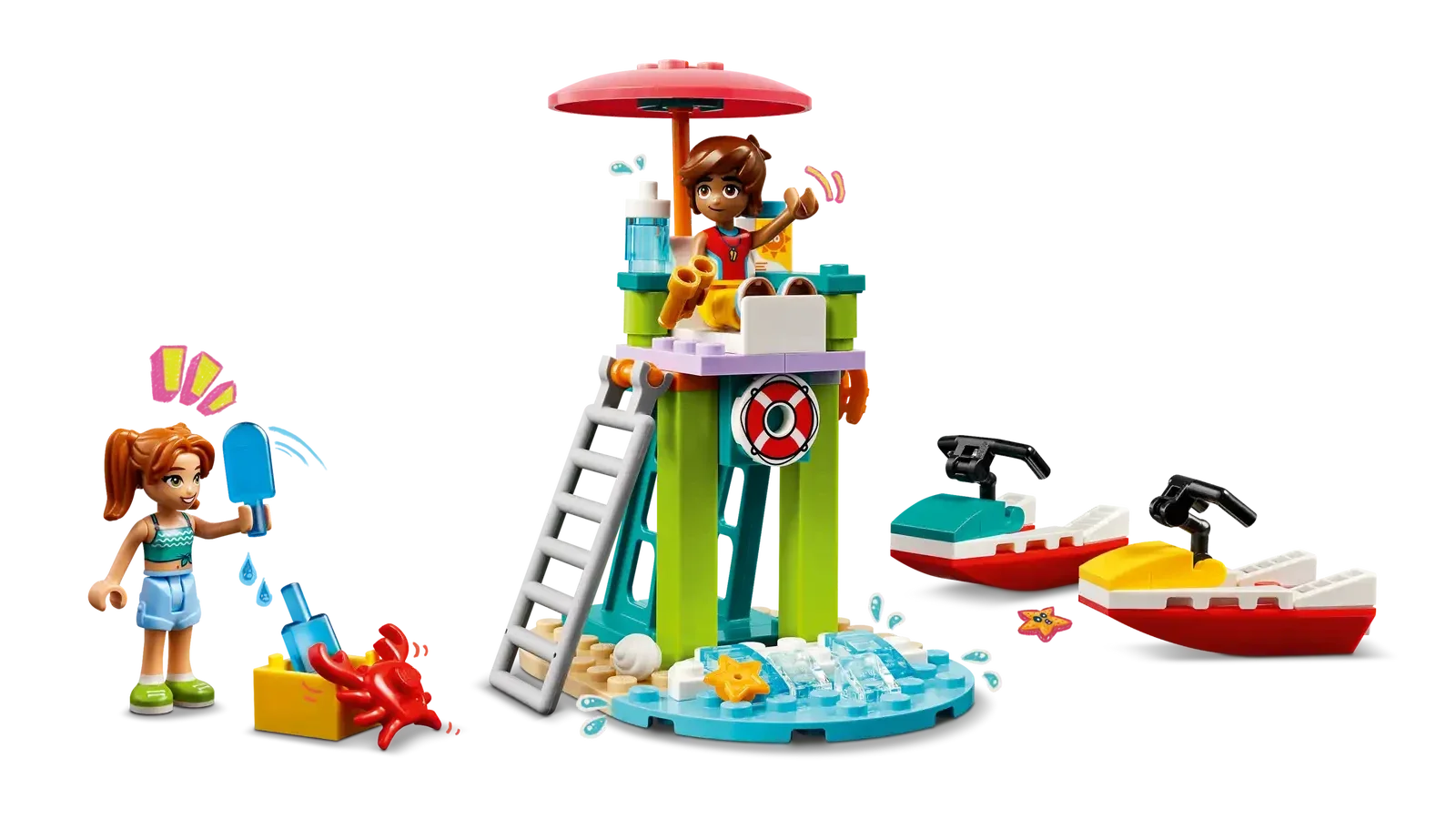 Deze LEGO set bevat 2 waterscooters, zodat kinderen het verhaal kunnen naspelen. Leo heeft strandwachtdienst en gebruikt de verrekijker om een oogje in het zeil te houden. Het is ook het ideale uitkijkpunt om dolfijnen te spotten. Later voegt hij zich bij zijn vriendin Candi en de vrienden racen op hun waterscooters. Kinderen zullen dol zijn op de details, zoals de brutale krab die graag de koelbox plundert op zoek naar ijsjes!