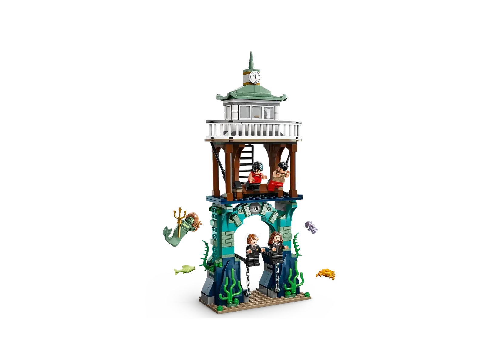 Breng een klassieke scène uit Harry Potter en de Vuurbeker™ tot leven met 5 LEGO minifiguren, waaronder Harry Potter met zwemvliezen en Viktor Kruml met een haaienkop, en help hen om Hermelien Griffel™ en Ron Wemel™ te redden. Inclusief een minifiguur van een Meermens, een Wierling die nieuw is in maart 2023 en accessoires zoals de toverdrank Kieuwwier.