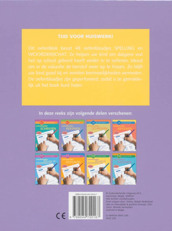 Dit oefenblok bevat 48 oefenblaadjes SPELLING en WOORDENSCHAT. Ze helpen uw kind om datgene wat het op school geleerd heeft verder in te oefenen. Ideaal om in de vakantie de leerstof weer op te frissen. Zo blijft uw kind goed bij en worden leermoeilijkheden vermeden. De oefenblaadjes zijn geperforeerd, zodat u ze gemakkelijk uit het boek kunt halen.