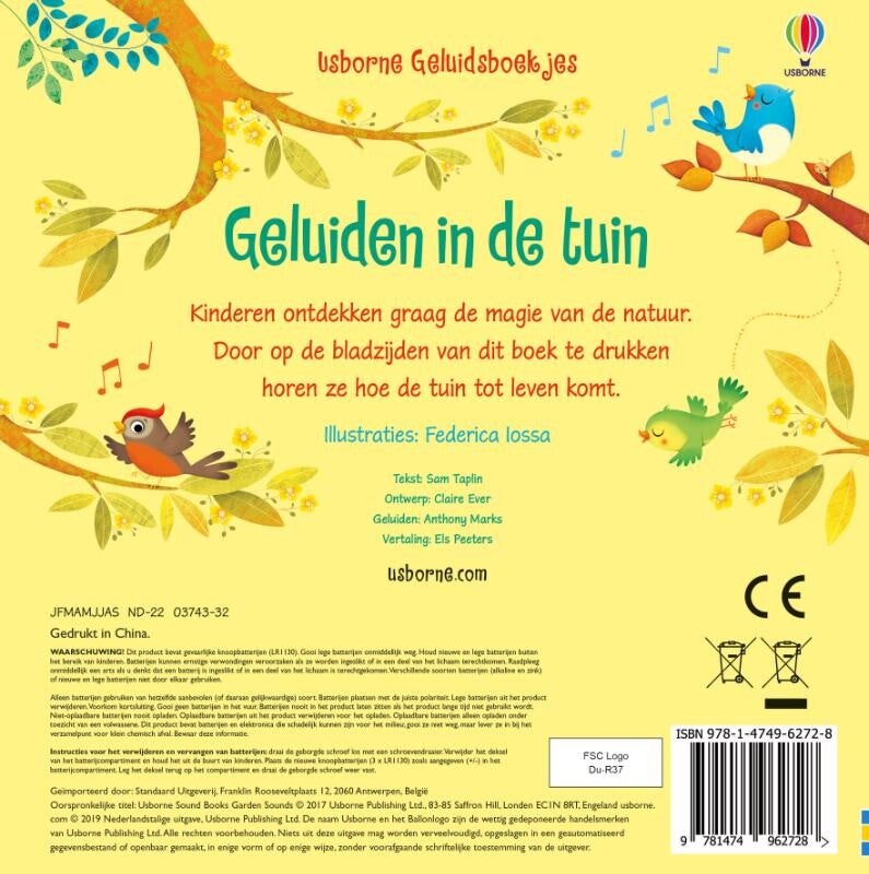 Als kleine kinderen op de knoppen in dit mooie boek drukken, horen ze een babyvogeltje piepen, kikkers in de vijver en uilen in de bomen. Kleurige pagina’s met afbeeldingen van de tuin en vijver in de zon, regen en ’s nachts. Met eenvoudige tekst, gaatjes om doorheen te gluren en texturen om te voelen is dit een prachtig eerste boek over de natuur en het buitenleven.