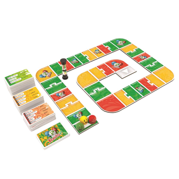 Contenu : 202 cartes Début, 18 cartes Défi, 3 pions Équipe, 15 tuiles Plateau, 1 sablier et 1 livret de règles.