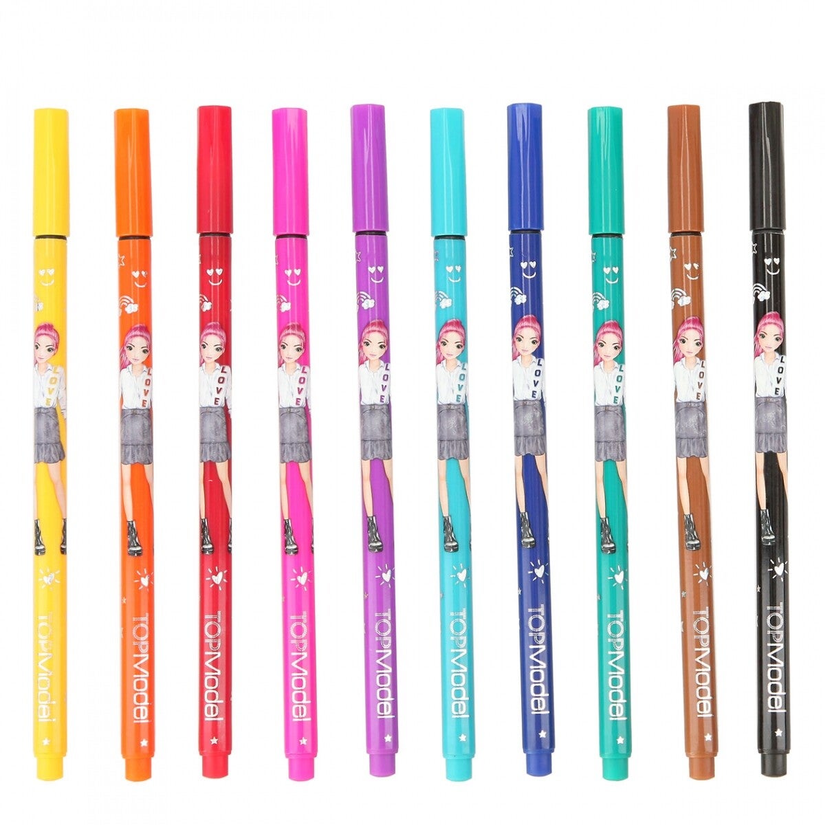 Fin, très fin, encore plus fin : set de stylos de 10 couleurs différentes (jaune , rouge, brun, orange, rose fuchsia, violet, turquoise, vert, bleu, noir). Le set comprend : 2 pochoirs pour le lettrage créatif. Le tout emballé dans une trousse transparente.