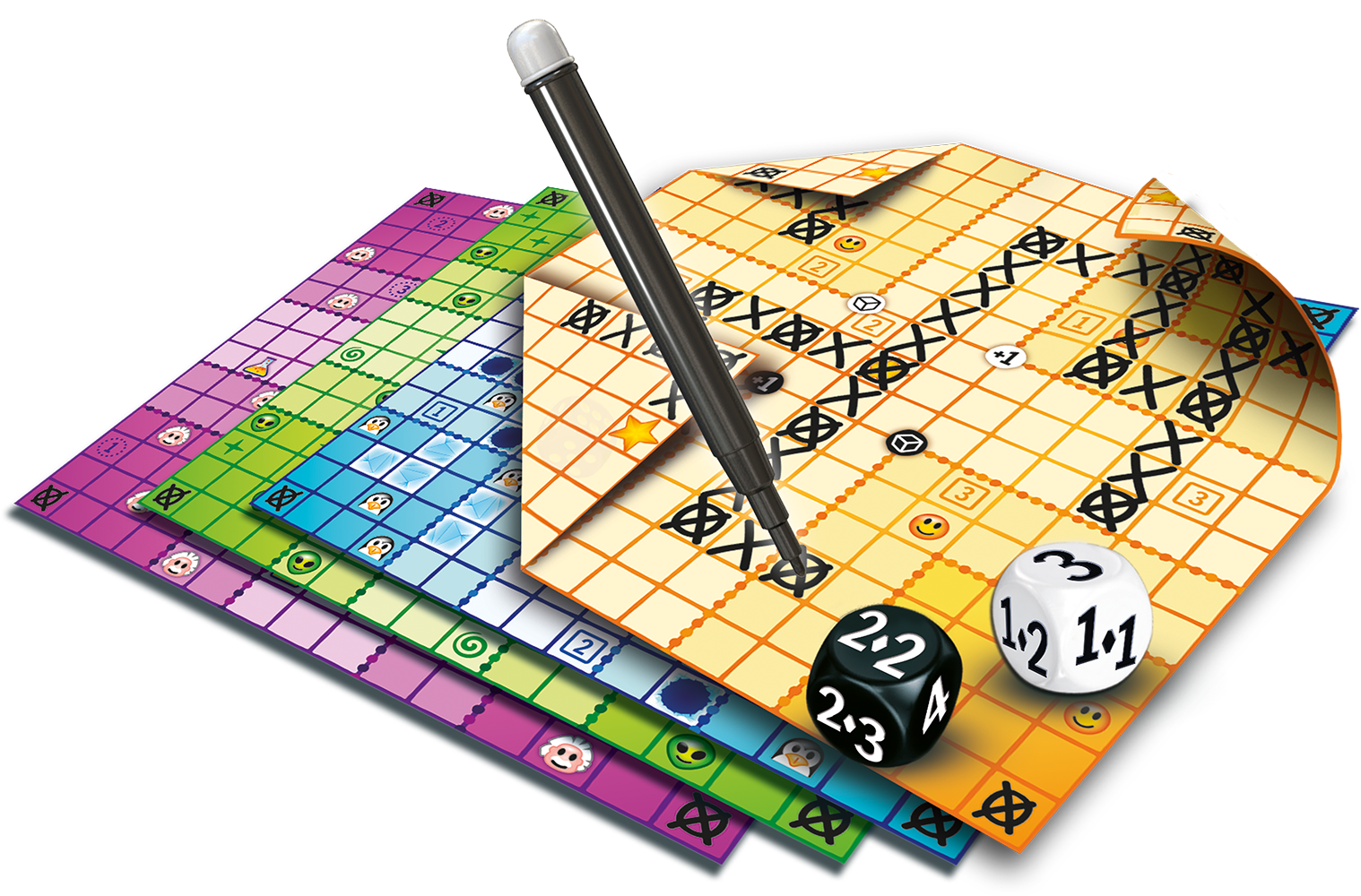 Rol met de twee dobbelstenen en kies een dobbelsteen om zo vakjes op je scorevel aan te kruisen. Je wint als je alle doelsymbolen door middel van aangekruiste vakjes met elkaar weet te verbinden. Maar wat als sommige doelsymbolen op de achterzijde van je scorevel zitten?
