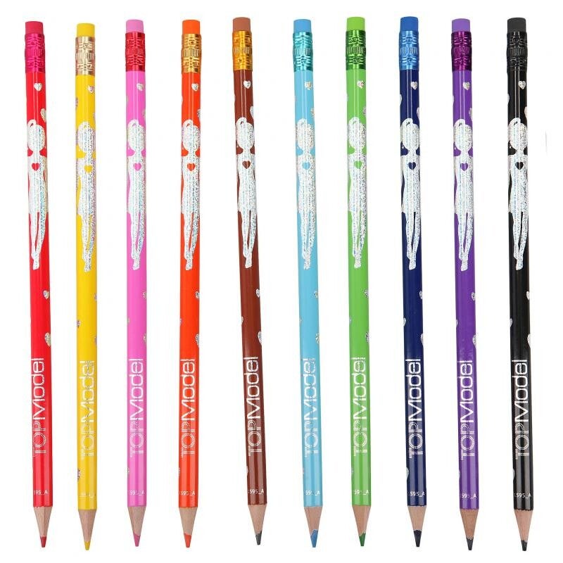 Nu wordt het kleurrijk: met deze tien kleurpotloden worden alle TOPModels, hun coole outfits en je eigen fantasievolle tekeningen schitterend! En het beste: dankzij de gum die er als topper opzit, kun je elke foutje makkelijk weer uitgummen! So cool! Kleuren: geel, oranje, rood, roze, paars, donkerblauw, lichtblauw, groen, bruin & zwart.