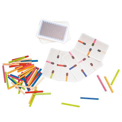 Contenu: 55 cartes (chaque carte montre 4 allumettes de 2, 3 ou 4 couleurs différentes), 48 bâtons en bois (6 couleurs, 8 de chaque), 1 règle du jeu.