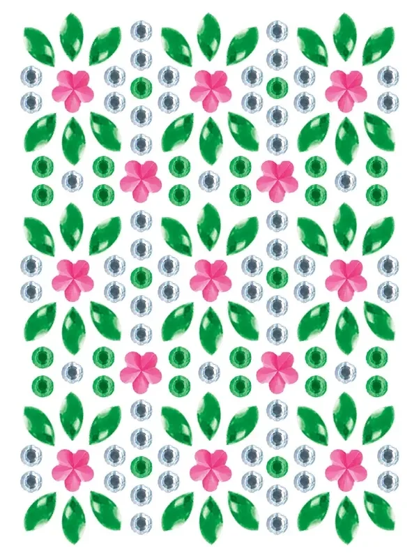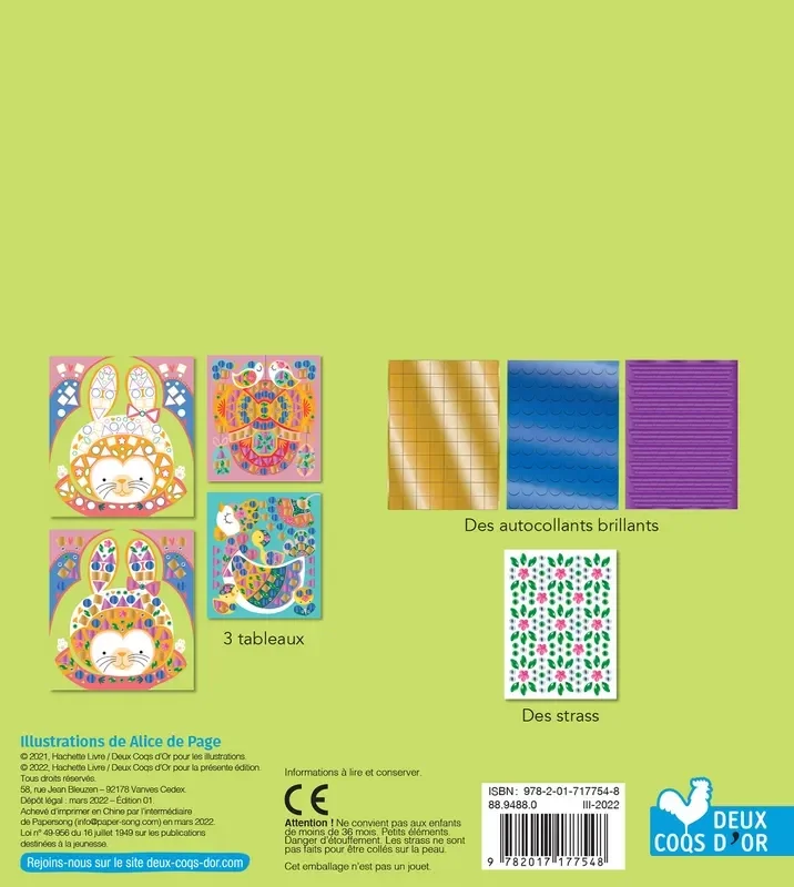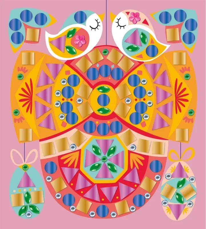 3 tableaux à compléter grâce à 160 strass autocollants et 270 stickers métallisés. À l'aide d'un mode d'emploi et en suivant les modèles, l'enfant va coller les autocollants et réaliser les tableaux.